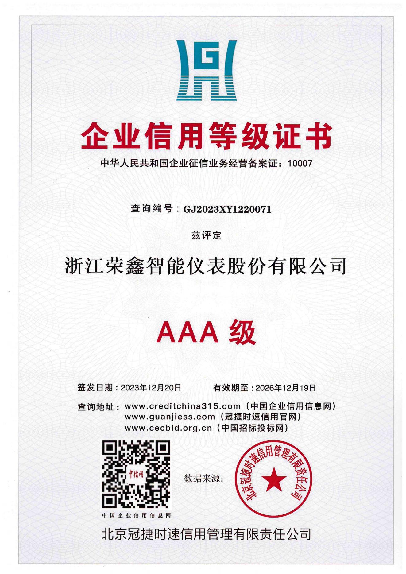 AAA信用等級證書