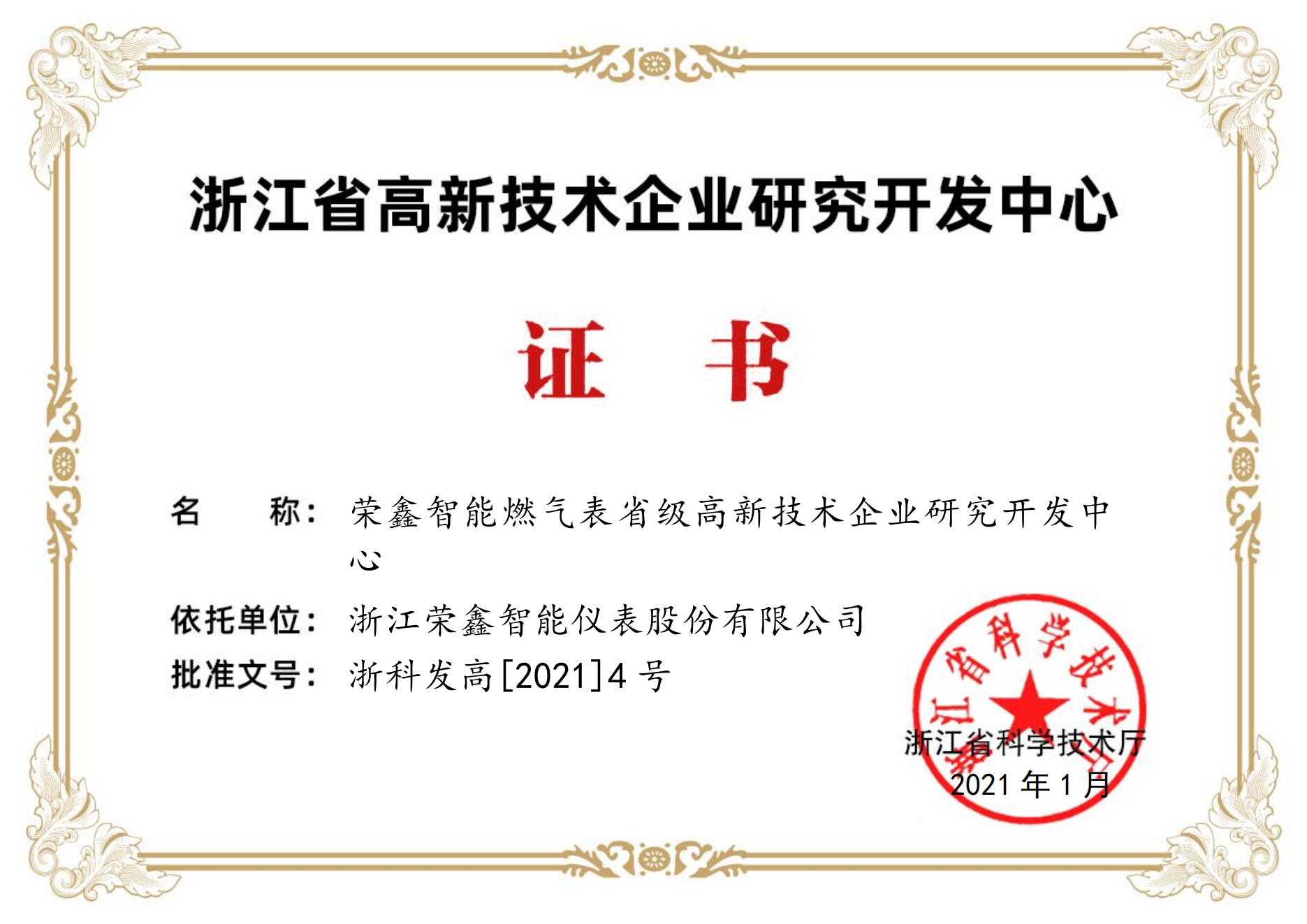 浙江省高新技術企業(yè)研發(fā)中心證書